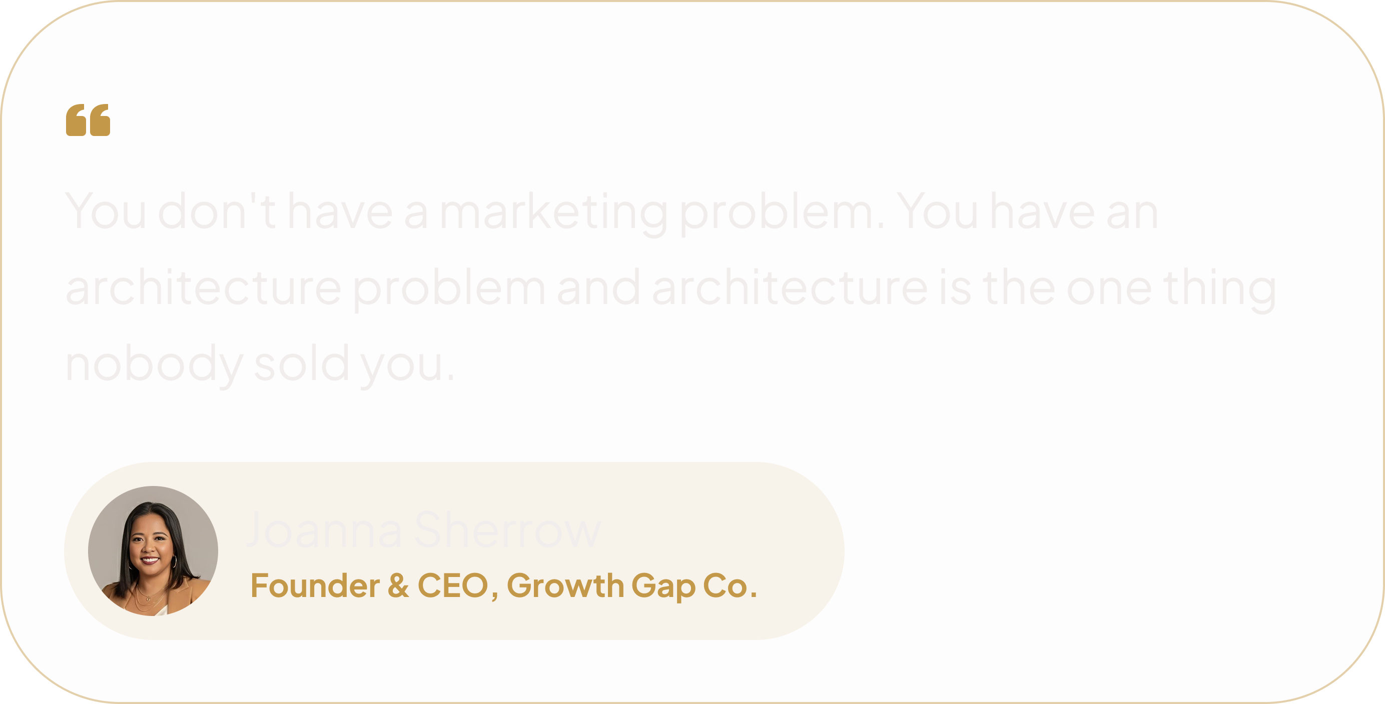 Joanna Sherrow is not here to tell you what to build. She has already built it the design agency, the CRM platform, the methodology and she built all of it while carrying the exact founder-dependency problem her clients bring to her now. She knows what it costs. She knows what it takes to close it. And she knows the difference between a plan that looks right on paper and architecture that actually runs.